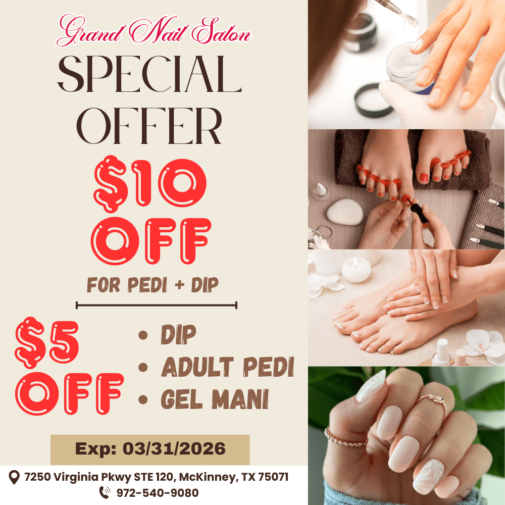 Grand Nail Salon is one of the best nail salons located conveniently in McKinney, Texas 75071. An airy, clean space with a friendly and relaxing atmosphere would let you feel the most comfortable moment.